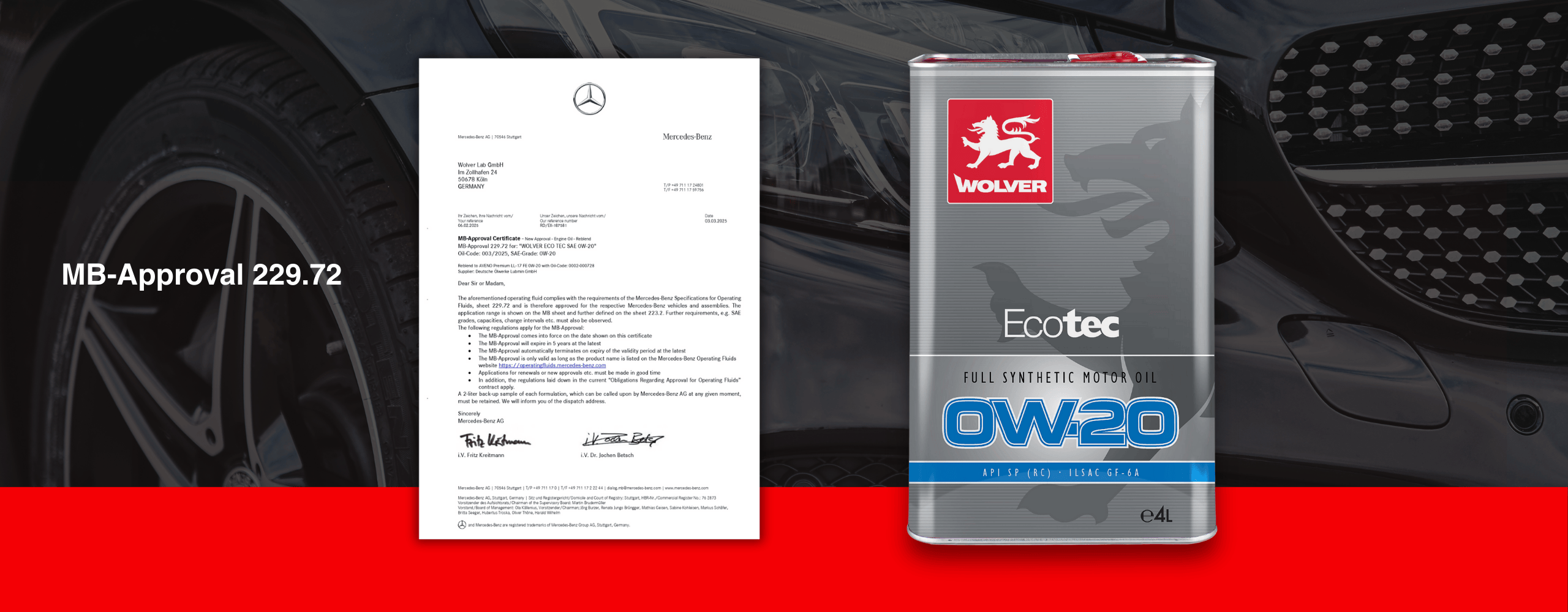 Wir freuen uns, bekannt zu geben, dass das Motoröl Wolver Ecotec SAE 0W-20 erfolgreich die Zertifizierungsprüfungen bestanden und offiziell die MB-Freigabe 229.72 von Mercedes-Benz erhalten hat. Diese Freigabe bestätigt, dass das Öl den höchsten Anforderungen des Herstellers an Qualität, Effizienz und Motorschutz entspricht.
