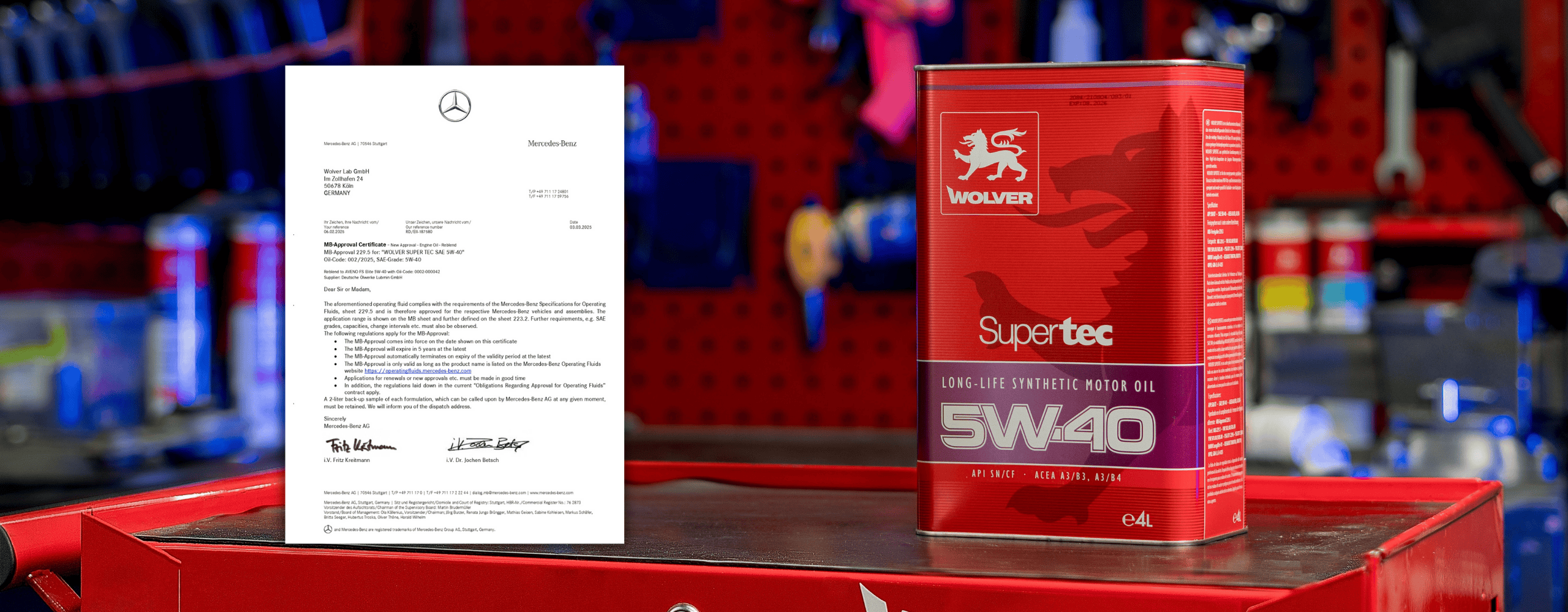 Wir freuen uns, Ihnen mitteilen zu können, dass das Motoröl Wolver Supertec SAE 5W-40 die Prüfungen erfolgreich bestanden und die offizielle MB-Freigabe 229.5 von Mercedes-Benz erhalten hat! Diese Freigabe bestätigt die höchste Qualität und die Übereinstimmung unseres Produkts mit den strengen Standards von Mercedes-Benz.